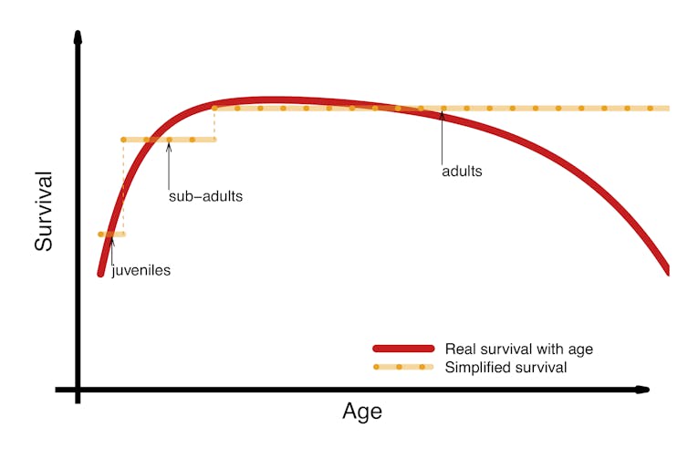 In our recent study we found that simplifying the information used to construct these models can distort the predictions. Survival and reproductive rates vary in individuals as they age and each species has a very particular trend associated with their age.
