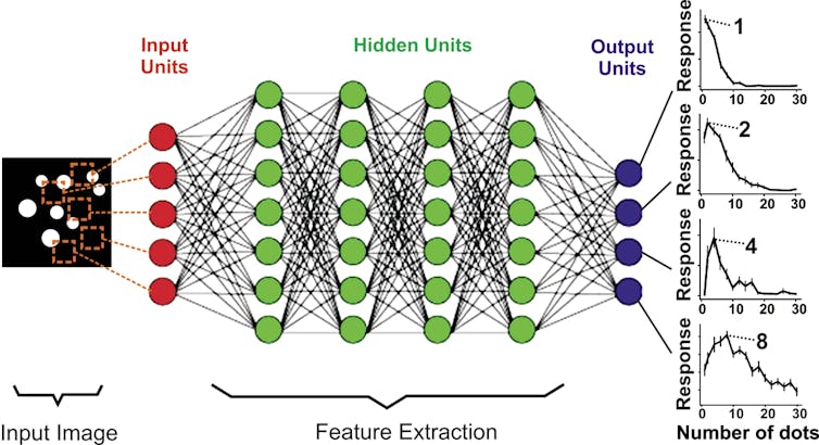 In the new study, a deep neural network that was trained for simple visual object detection spontaneously developed this kind of number sense. The researchers discovered that specific units within the network suddenly “tuned” to an abstract number – just like real neurons in the brain might respond. It realized that a picture of four apples is similar to a picture of four cats – because they have “four” in common.