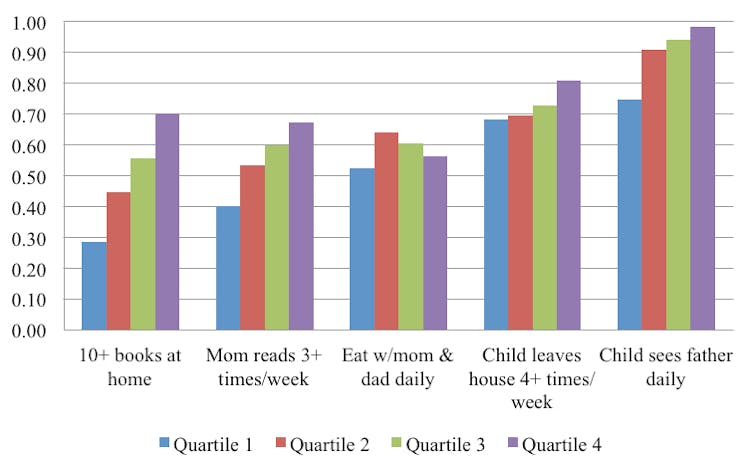 These income-based achievement gaps are at least partially caused by substantial differences in how much rich and poor parents invest in their children. For example, parents of very young children among the top 25% of earners are more than twice as likely to have at least ten books in the home than those from the bottom quartile. Wealthier mothers are also more than 50% more likely to read to their child three or more times a week.
