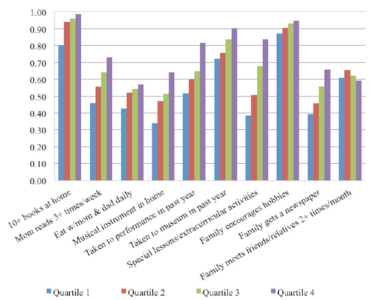 In addition, children aged 6 to 7 from richer families are more than twice as likely to be enrolled in special lessons or extracurricular activities compared with their lower-income counterparts.