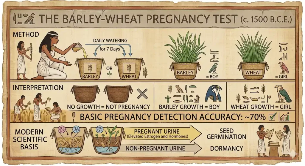 Long before the rise of laboratory diagnostics, ancient Egyptian physicians developed one of the earliest recorded biological tests for pregnancy. Found in medical texts such as the Ebers Papyrus (circa 1550 B.C.E.), the method appears deceptively simple. A woman suspected of being pregnant would urinate on bags of barley and emmer wheat over a period of days. If the grains germinated, pregnancy was considered likely. If they did not, the result was interpreted as negative.
